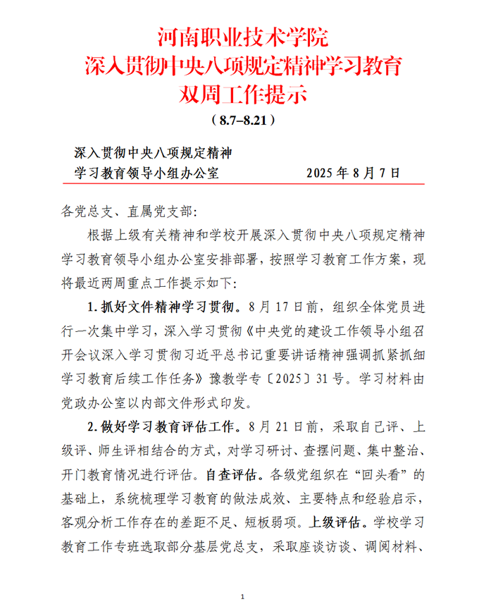 河南职业技术学院深入贯彻中央八项规定精神学习教育双周工作提示