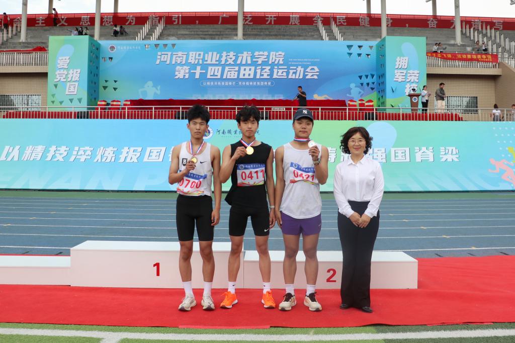 校党委委员、副校长肖珑为男子100米获奖学生颁奖