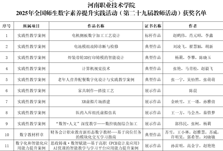 近年来,学校持续深化教育教学改革,将数字素养提升作为教师队伍建设的重要抓手,鼓励教师将数字技术融入教学设计、课堂实施与评价反馈全流程。此次获奖充分彰显了学校在教育教学数字化转型中的创新成果,以及教师团队的专业实力。同时,学校也将以此次获奖为契机,继续加大数字教育资源投入力度,支持教师开展教学创新研究,推动数字技术与教育教学的更深层次融合,为培养适应数字时代的高技能人才筑牢坚实基础。(供稿:刘凌飞;审稿:刘旺余)
