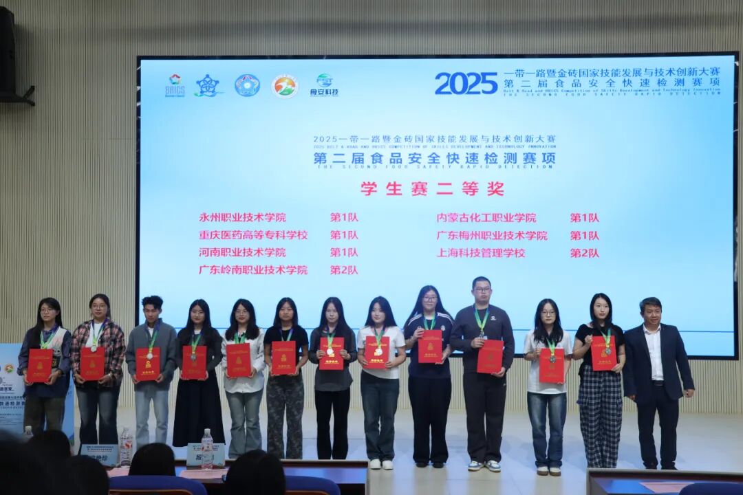 本次大赛由金砖国家工商理事会中方理事会、“一带一路”暨金砖国家技能发展国际联盟等单位主办,中国发明协会、教育部中外人文交流中心联合主办,是国内食品安全快速检测领域的高水平赛事。比赛历时四天,涵盖有机磷农药残留、粮食中铅镉检测等核心实操项目,重点考查选手的操作规范性、数据准确度以及技术应用能力,对参赛队伍的专业素养和实践能力提出了极高要求。比赛过程中,选手们沉着冷静、默契配合,在操作精准度、数据可靠性等方面表现出过硬的专业素养,赢得了裁判组的一致认可。经过激烈角逐,最终斩获一金一银的优异成绩,为学校争得了荣誉。