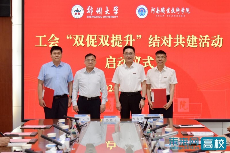 6月11日下午,河南职业技术学院与郑州大学举行工会“双促双提升”结对共建签约仪式。郑州大学党委副书记、工会主席韩国河,河南职业技术学院党委书记厉励出席签约仪式并致辞。郑州大学工会副主席杨根顺,河南职业技术学院党委委员、副校长朱永宽参加签约仪式。河南职业技术学院党委副书记、工会主席田华主持签约仪式。