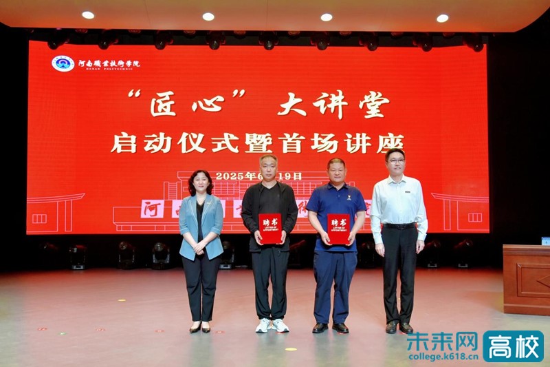 6月19日下午,河南职业技术学院“匠心”大讲堂启动仪式暨首场讲座举行。学校党委书记厉励,党委副书记、校长夏新颜为“匠心”大讲堂揭牌,并为郑州宇通集团有限公司焊接高级技师、焊接质量责任人牛东昌和河南航天液压气动技术有限公司特级技师彭战良两位校友颁发企业导师聘书。学校领导李玉峰、朱永宽出席启动活动。活动由学校党委副书记、工会主席田华主持。