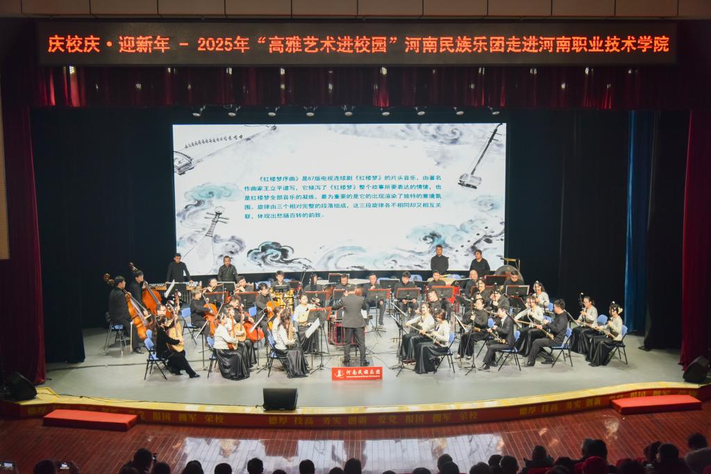 12月18日晚,河南职业技术学院在音乐厅举办“庆校庆迎新年”2025年“高雅艺术进校园”河南民族乐团专场音乐会。本场音乐会以艺术献礼校庆,既是对学校71载办学荣光的深情致敬,也是对新年到来的美好期许。校领导厉励、田华、李玉峰、鲁冬及各有关单位负责同志、师生代表共500余人共同观看了演出。