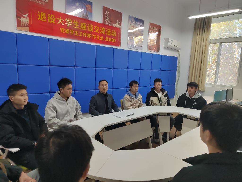 11月19日下午,学校党委学生工作部在勤业楼420会议室组织召开以“荣耀归校,接续奋斗”为主题的退役大学生座谈交流活动。党委学生工作部相关同志、各二级学院退役大学生代表齐聚一堂,畅谈军旅感悟,共话成长未来。