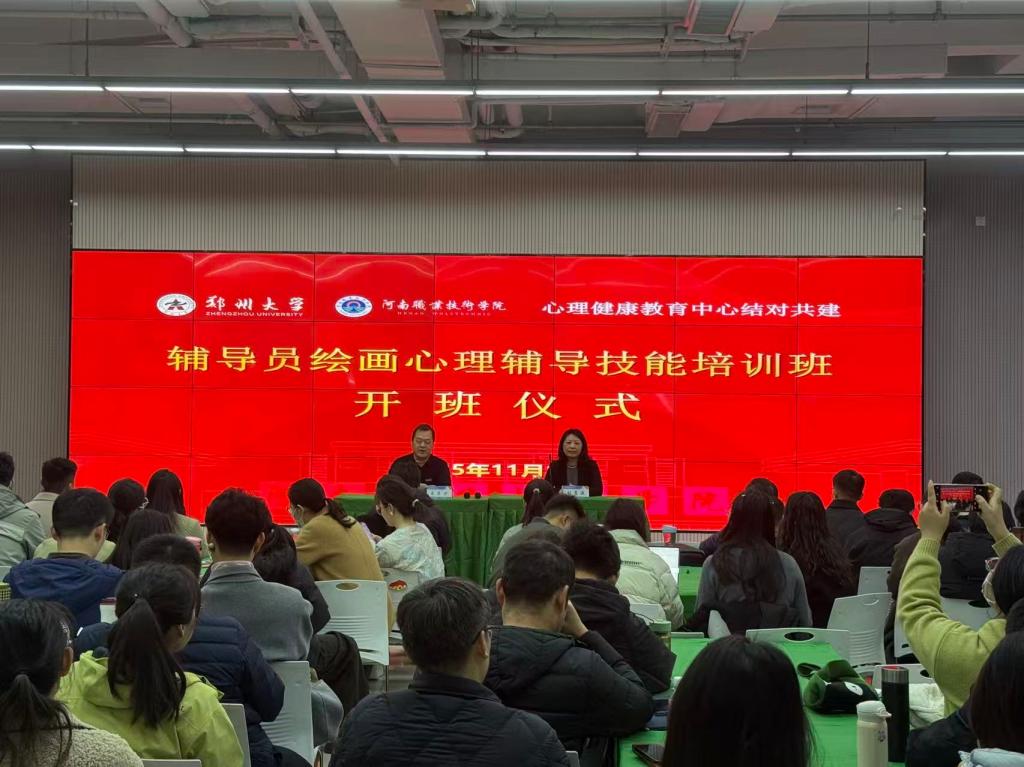 11月19日至20日,学校在创新港519室举办“辅导员绘画心理辅导技能”专题培训,进一步丰富辅导员心理健康教育手段,提升心理辅导的专业性和有效性。本次培训邀请郑州大学心理健康教育中心主任刘慧瀛教授进行现场教学,学工部部长宋东方主持开班仪式并讲话,各二级学院党总支副书记、团总支(学工办)书记、全体专兼职辅导员、心理健康专兼职教师等共计170余人参加培训。