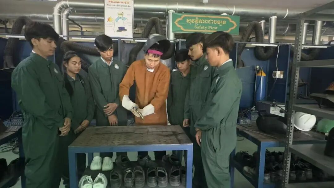 他教的是智能焊接,一个班25名学生。设备简陋、语言不通,但他硬是靠着一台翻译机、无数手势比划、反复板书演示,把焊接符号、工艺图纸、焊接参数选择——这些柬埔寨学生从未系统接触过的理论知识,一点点“焊”进了他们的认知中。