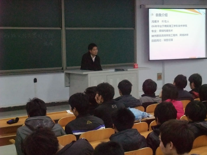 为了使学生进一步了解IT行业的就业前景,提高学生的学习积极性, 3月14日晚上,该院邀请神州数码网络有限公司河南区域行业经理冯居洋先生为学生做了 “做最好的自己”专题讲座。