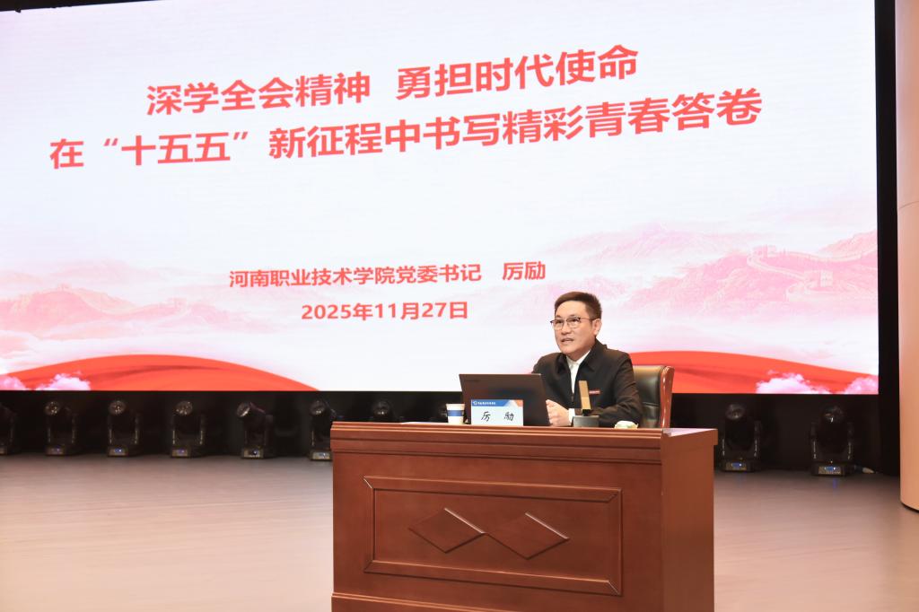 11月27日下午,校党委书记厉励以《深学全会精神、勇担时代使命——在“十五五”新征程中书写精彩青春答卷》为题,为学校青年学生宣讲党的二十届四中全会精神。第七期校青马班学员、第一期团校学员、校院两级学生会主要学生干部代表、国旗护卫队全体成员、电子与物联网学院电子信息工程技术253班全体同学,以及党委宣传部、校团委等部门负责同志共500余人现场聆听。校党委副书记、工会主席田华主持宣讲会。