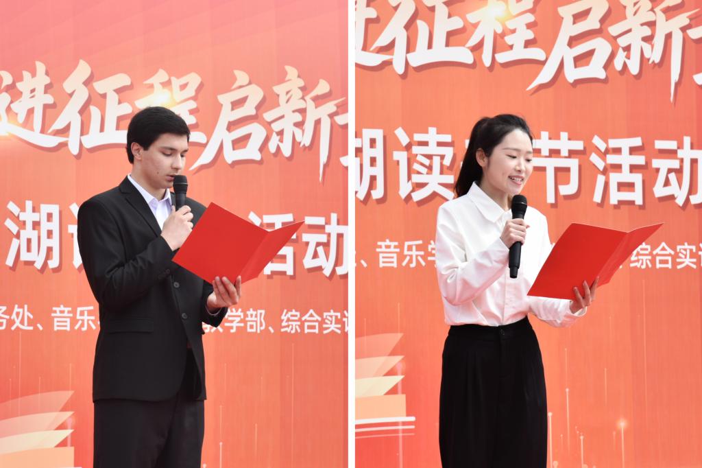 开幕式上,校党委委员、副校长朱永宽与钮海琴共同完成了图书捐赠交接仪式,并向国际教育学院图书馆分馆进行了授牌;国际教育学院谢南、朱叶作为学生代表发言,分享读书感悟,传递阅读热情;师生代表展演了器乐书法《墨韵筝鸣》、舞蹈《巾帼忠魂》和诵读《长征·永远的路》等节目,以多元艺术形式诠释书香校园活力与风采。