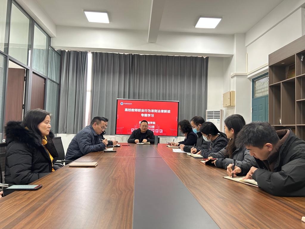 学习过程中,学院统筹安排学习流程,围绕高校教师职业行为的法律边界、风险防控要点等核心内容开展研讨。老师们结合教育教学、学术研究、师生交往等实际工作场景交流心得,进一步明晰了职业行为规范要求,强化了依法执教的思想自觉。
