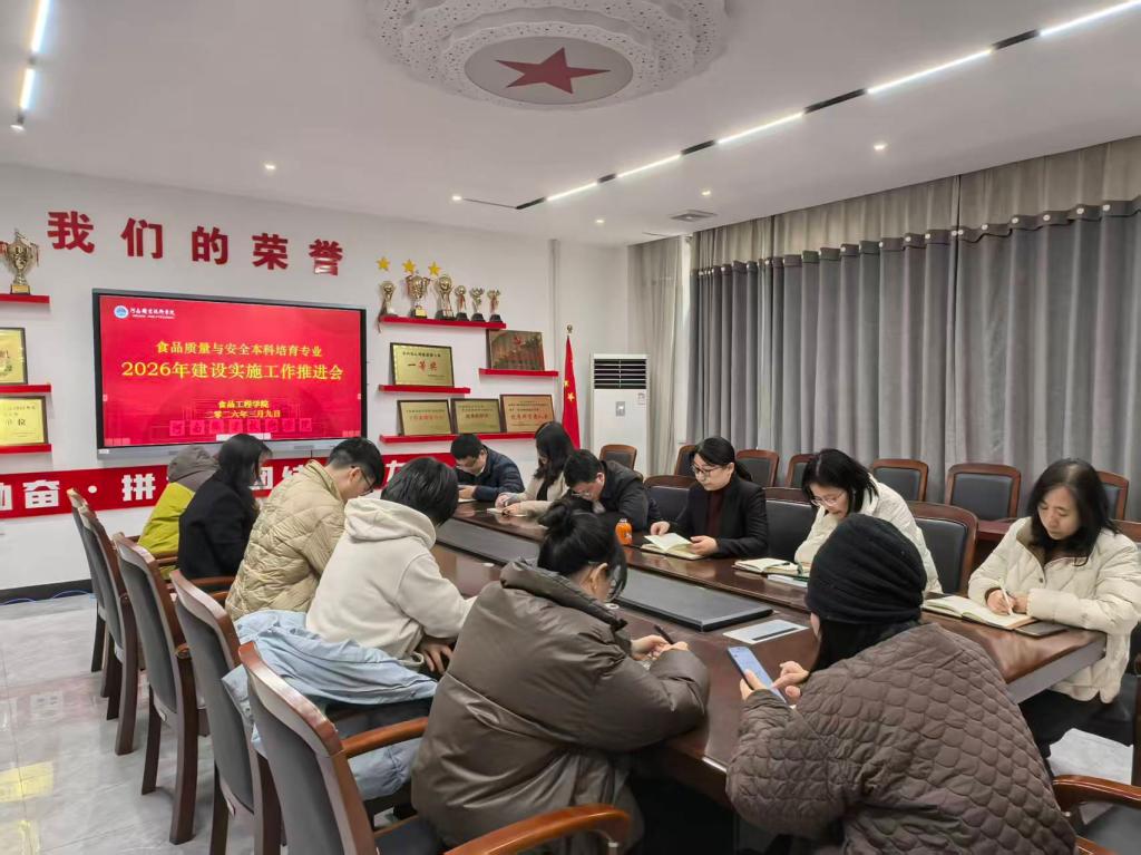 3月9日上午,学校食品工程学院召开食品质量与安全本科培育专业2026年建设实施工作推进会,深入贯彻学校升本筹建工作第四次会议精神,精准落实2026年本科层次职业教育专业培育建设要求,加快本科培育专业建设进程。院长胡二坤参加会议并作工作部署,食品类专业教研室主任及食品智能加工技术专业全体专兼职教师参会。