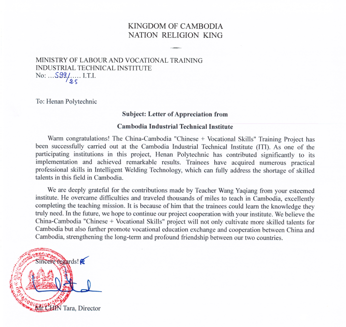 2025年10月,柬埔寨劳工与职业培训部和工业技术学院发来两封感谢信,感谢王亚强在50天中的教学奉献。王亚强说:“我觉得自己只是做了一件每位老师都会做的事,我认为我应该去做”。这份平凡中的坚守,构筑了职业教育国际合作的基石,更诠释了一所院校如何通过培养一位好老师,进而影响一批异国学生,最终加深两国友谊与合作的宏大叙事。